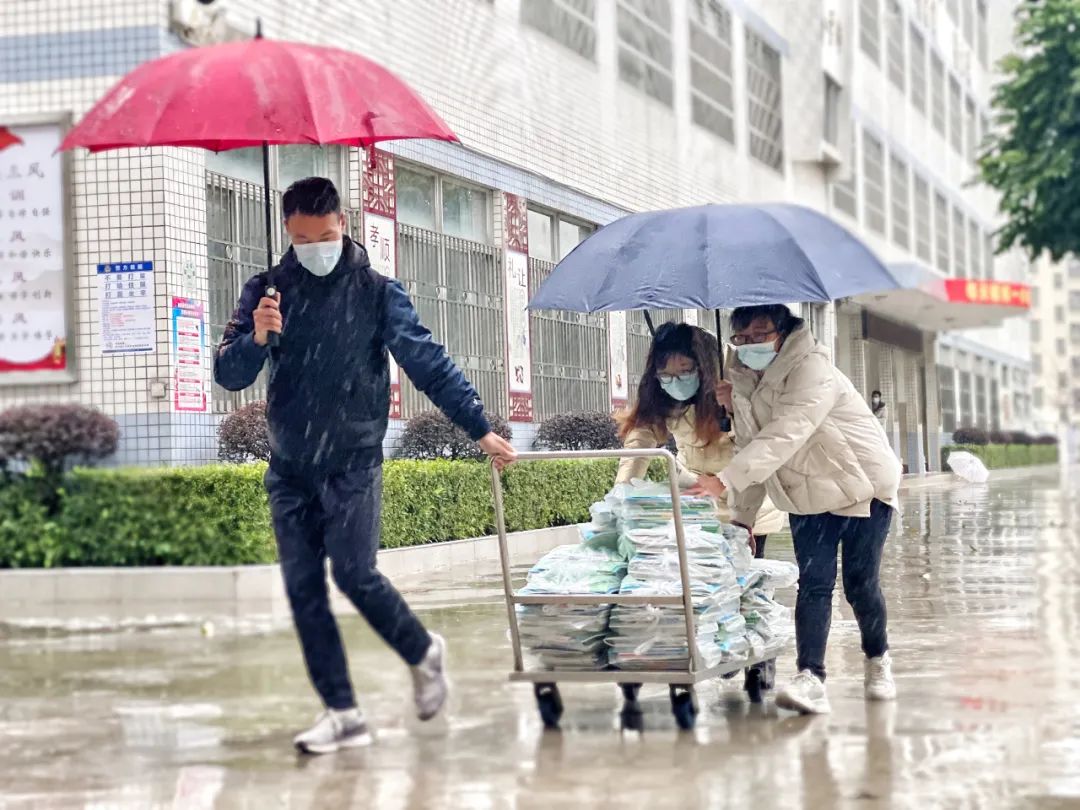 ■细雨觅书香,家校共联动。为保障4-6年级学生在线学习质、效,满足学生对纸质教材的实际需求,南山实验教育集团荔林小学组织党员志愿者、后勤员工和家长义工协助开展送书到家活动,以班级为单位组织分发打包,每班8支“书友队”队长在校门口统一领取教材,队长再将教材定点分发到队员。家校齐出力,2小时“流水线”高效、有序运转,共同守护学生线上学习。