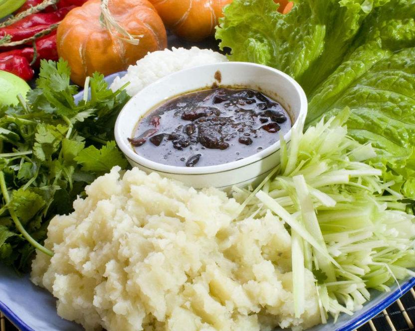 ©️《尚食》就是将白菜、酸菜等叶子放在手掌上,再把煮熟的米饭、炒菜和小葱、大酱放在上面,用双手将菜叶合上,或包成长卷形,以手握而食之。这一作法在明朝刘若愚《酌中志》中就有记载:“又以各样精肥肉,姜、蒜锉如豆大,拌饭,以莴苣大叶裹食之,名曰‘包儿饭’ 。”