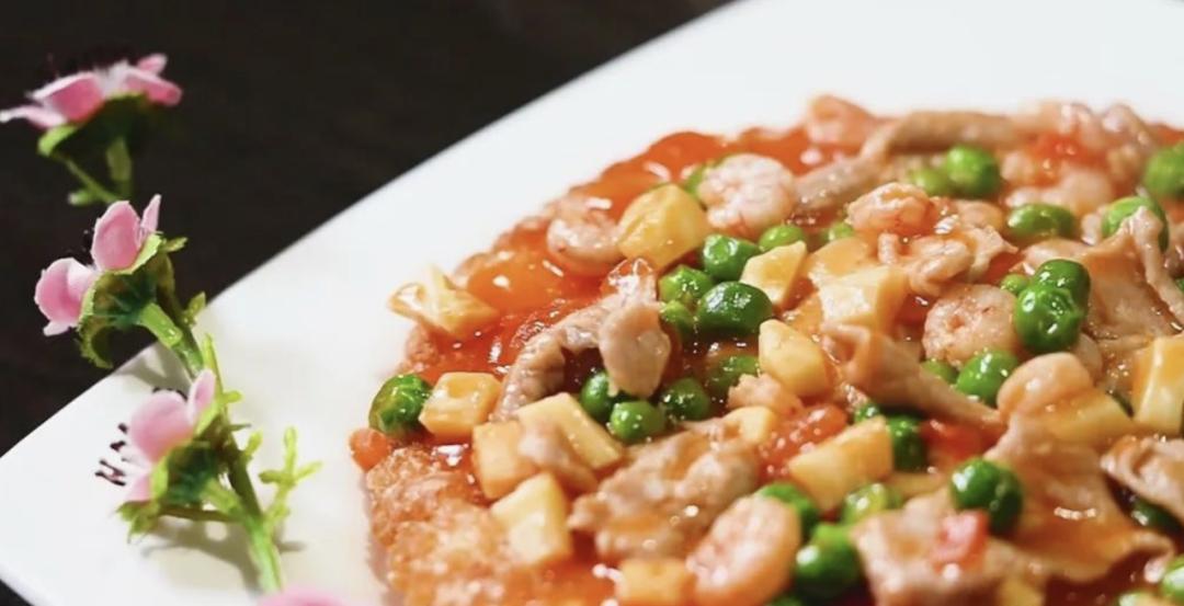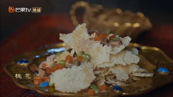 从剧中也能看出,这道菜的原料是油炸后的锅巴,浇上番茄汁缀以虾仁而成,因成菜色彩艳丽犹如一朵朵盛开的桃花,故名。虾仁的美味,锅巴的香脆,在番茄酸甜汤底的烘托下,绝对承担得起色、香、味俱全。