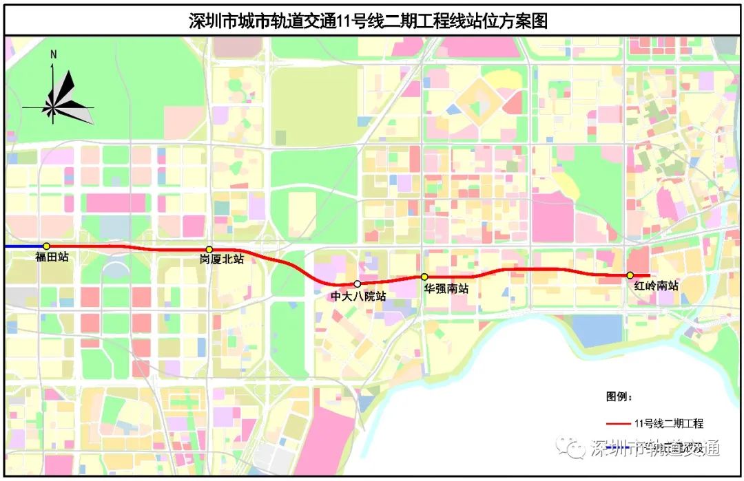 地铁11号线二期线路起自福田区福田站(不含),沿深南大道、福华路、南园路、埔尾路-金华街东行,终至红岭南站。线路全长约5.58km,共设4座车站3个区间,全线采用地下敷设方式。