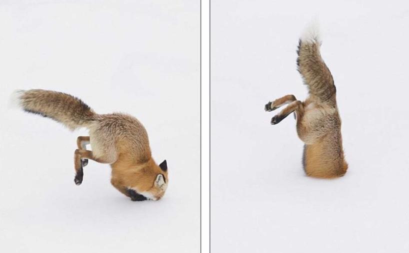赤狐的跳扑是一种特殊的独门绝技,冬季寒冷地区的地表会被厚厚的积雪覆盖,赤狐为了捕食在雪下行动的鼠类动物,会凭借超强的嗅觉和听力捕获食物的位置,头朝下一插,把猎物牢牢抓住。
