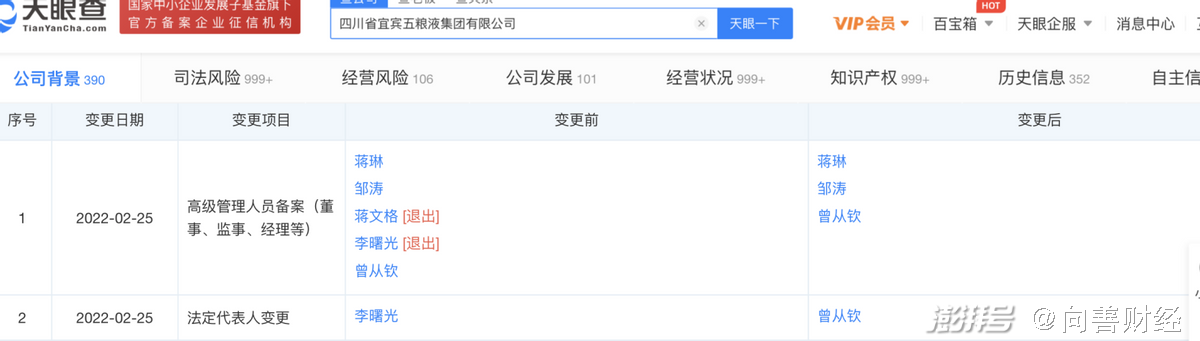 据多家媒体报道,任命曾从钦为五粮液集团党委书记、董事长,五粮液股份有限公司党委书记;2月18日,李曙光不再担任五粮液集团党委书记、党委委员、董事长,五粮液股份公司党委书记、党委委员等职务。天眼查APP显示公司法人已变更。