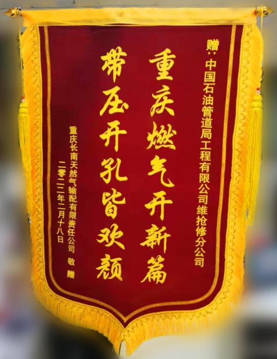 2月18日,重庆长南天然气输配公司送来锦旗,对抢险中心圆满完成涪陵工区乌江南集输干线至梓白线应急连头工程表示感谢 。
