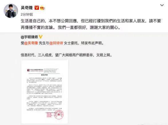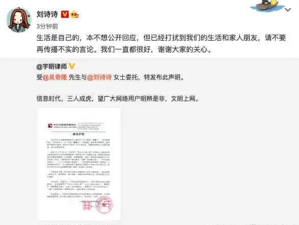 然而,一纸律师函没有堵住造谣者的嘴,仍然有部分网友认为“娱乐圈的瓜不是无中生有的,无风起浪。”“哪能分得清娱乐圈的夫妻哪对真恩爱哪对假恩爱?”“明星离婚前都会冒充网友曝光自己离婚试试水,等到时机成熟再发文官宣。”等。2月27日晚,吴奇隆刘诗诗夫妇委托律师发布声明,表示已经向虚构、捏造谣言的网络相关用户提起诉讼,以维护合法权益。并配文:“生活是自己的,本不想公开回应,但已经打扰到我们的生活和家人朋友,请不要再传播不实的言论。我们一直都很好,谢谢大家的关心。”