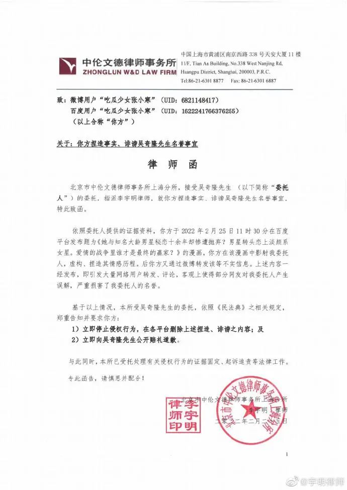 2月25日,作为当事人的吴奇隆向这位八卦博主发送了律师函,称其严重损害了本人名誉,要求立即停止侵权行为,在各平台删除捏造、诽谤内容,并立即赔礼道歉。此外,律所表示已受托处理有关侵权行为的证据固定、起诉追责等法律工作。