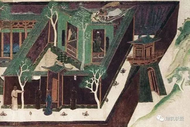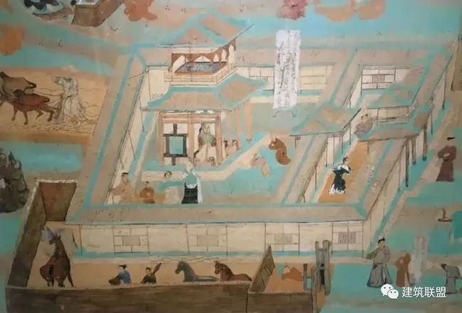 莫高窟第61窟大清凉寺局部至于平民住宅平面的配置,在许多变相图两侧的小画幅中可以窥见。其中所表现的虽然多是宫殿或住宅的片段,一角或一部分,院内往往画住者的日常生活,其配置基本上与佛寺院落的分配大略相似。