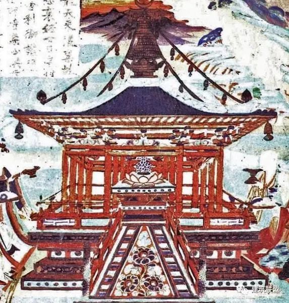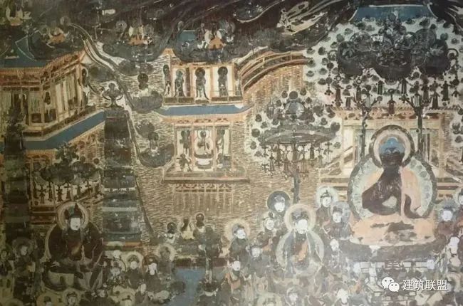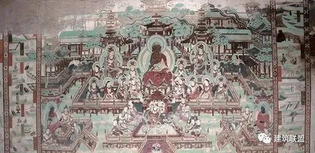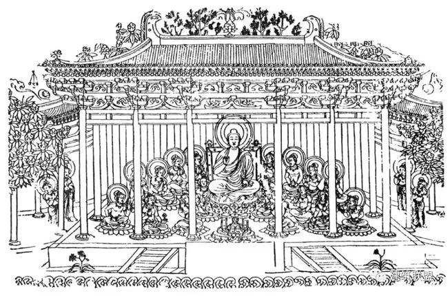 在各种变相图中,中央部分所画的建筑背景也是正殿居中,其后多有后殿,两侧有廊,廊又折而向前,左右有重层的楼阁,就是上述各庭院的内部景象。这种布局的画,计在数百幅以上,应是当时宫殿或佛寺最通常的配置,所以有如此普遍的表现。