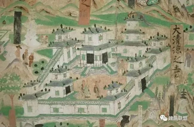 第六十一窟“五台山图”有伽蓝约六十余处,绝大多数都是同样的配置;其中“南台之顶”,正殿之前,左有三重塔,右有重楼,与日本奈良的法隆寺(7世纪)的平面配置极相似,日本的建筑史家认为这种配置是南朝的特征,非北方所有,我们在此有了强有力的反证,证明这种配置在北方也同样地使用。