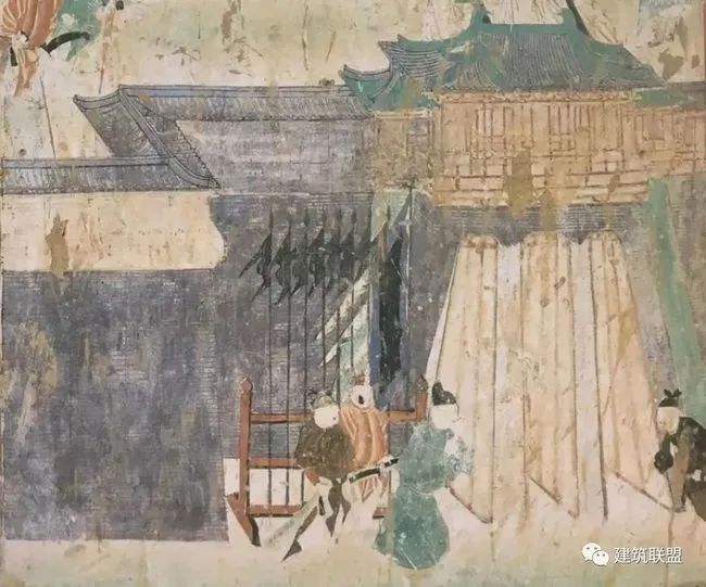 至于城门门扇上的门钉、铺首、角叶都与今天所用者相同。城墙上亦多有腰墙和垛口。后世常见的长城和敌台,则不见于壁画中。