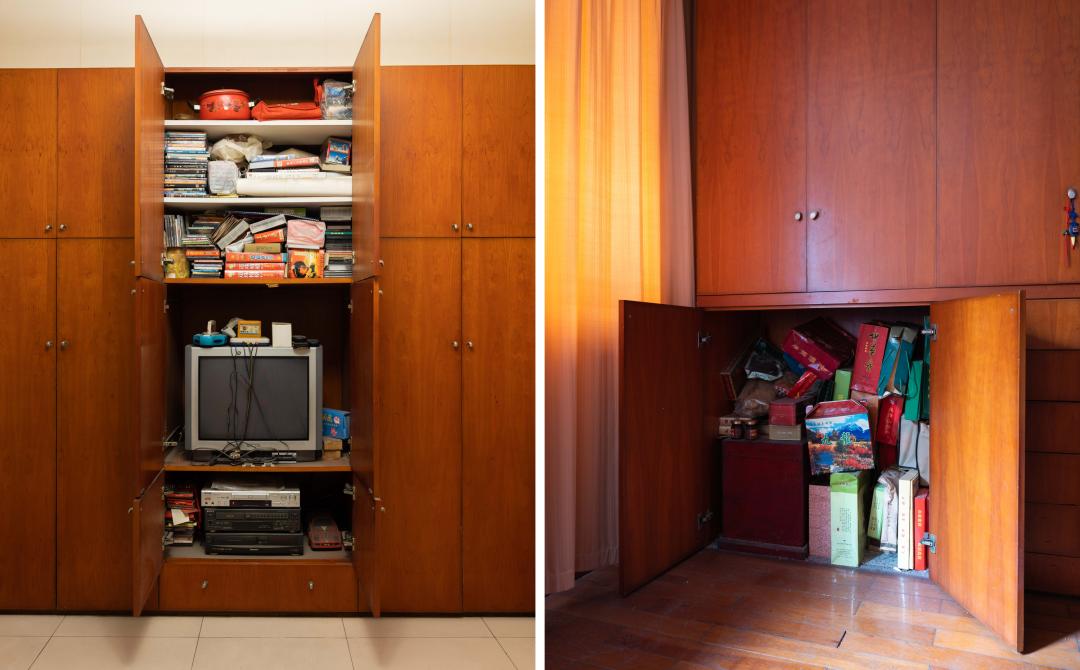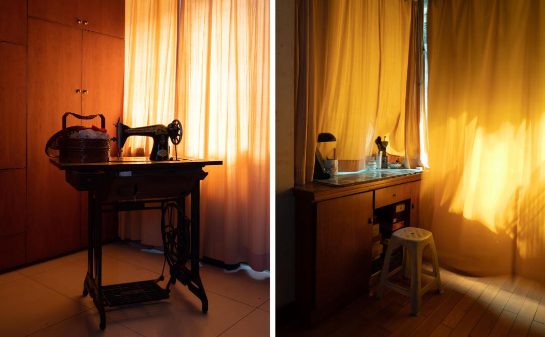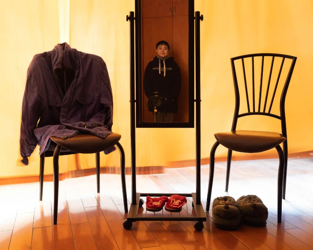与它相对的有一张老照片,是我们以前的合影。后来我找到了老照片里外公的衣服、外婆的鞋子、我的小鞋子,然后用了穿衣镜,就在他们的床边拍照。