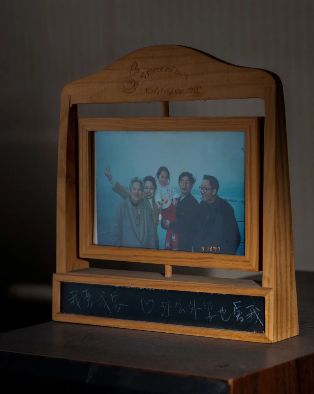 一家五口的合影,下面是吴为多年前用粉笔写的“我爱我家,外公外婆也爱我”从我有记忆开始,就有“一家五口”的概念。
