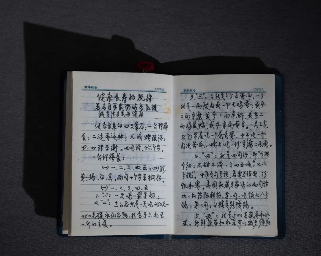 外公抄的长寿秘诀他对什么都感兴趣,会拉二胡,会打游戏。我发现他有好多本子写着养生秘诀,多吃什么,少吃什么,不能吃什么,怎样可以长寿,抄了好多。想到他最后走得很早,我觉得很难过。