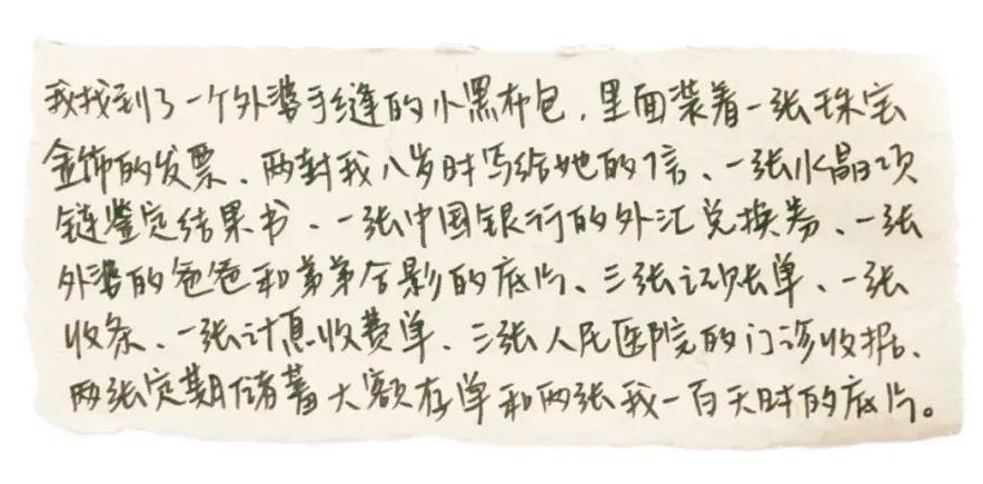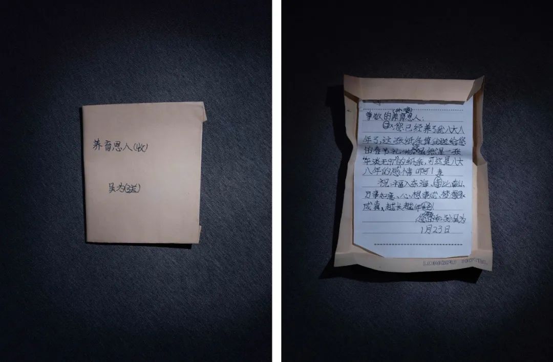 小黑布包里,有8岁的吴为写给“养育恩人”的一封信:“您已经养了我八年了,这张纸条算我送给您的春节礼物。虽然是一张平淡无奇的纸条,可这是八年的感情啊!”我也看到很多我小时候写给他们的信,里面还有拼音、错别字,我都不记得了。还有我从各地寄回家的礼物,上面写的“to 外公”、“to 外婆”,都被他们很好地放在一个又一个的袋子里,但没想到的是,这些东西最后竟然又回到了我的手里。