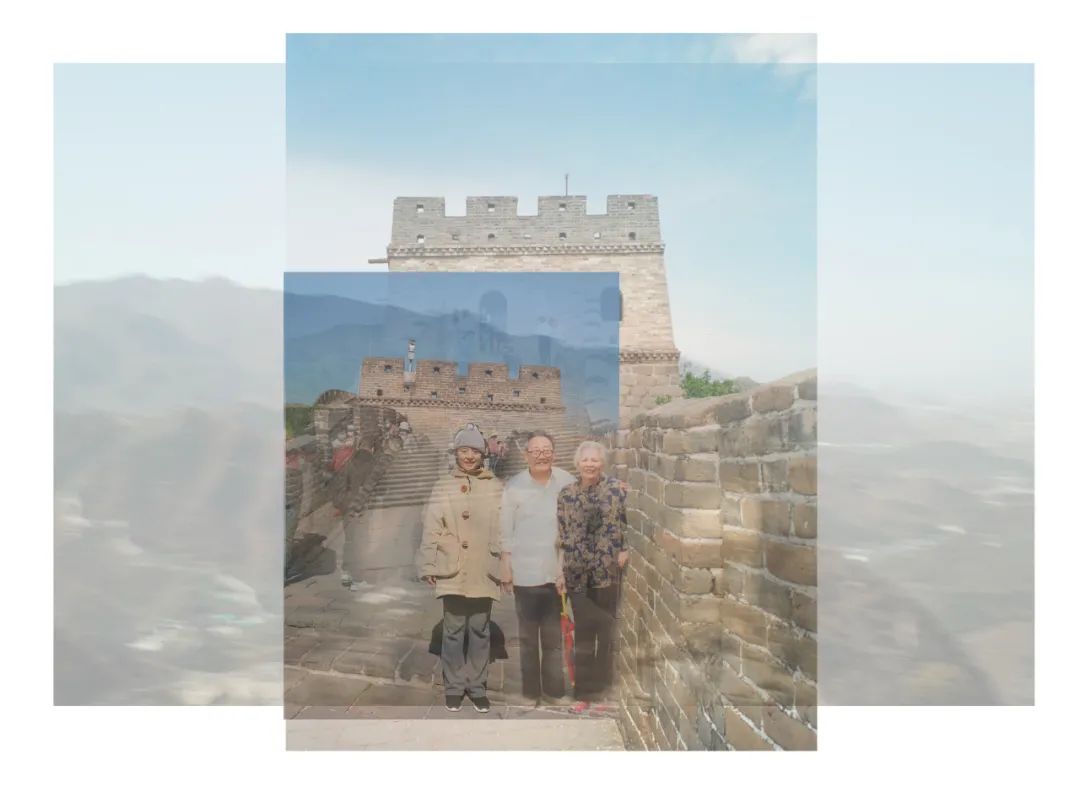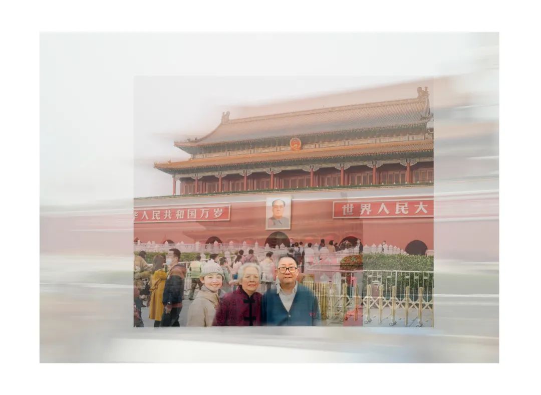 “北京重游”系列,在八达岭长城和天安门广场很多人问我什么时候开始计划拍摄的,其实可以追溯到外婆去世的时候。我当时翻到了几本相册,是我10岁的时候,一家人去北京玩,有我跟他们的合影,也有两个老人的合影,当时我就想,一定要用这些照片做点什么。