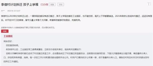 网友咨询:李信村从2019年计划拆迁以后,一直到现在都没有进行搬迁,孩子上学现在都在工业园区,也不能住校,每天上下学都要接送。2021年政府公告说年内搬迁,迟迟没有落实。对于在外打工的家庭,留守儿童上学是个大问题,希望政府能够尽快落实,利国利民。