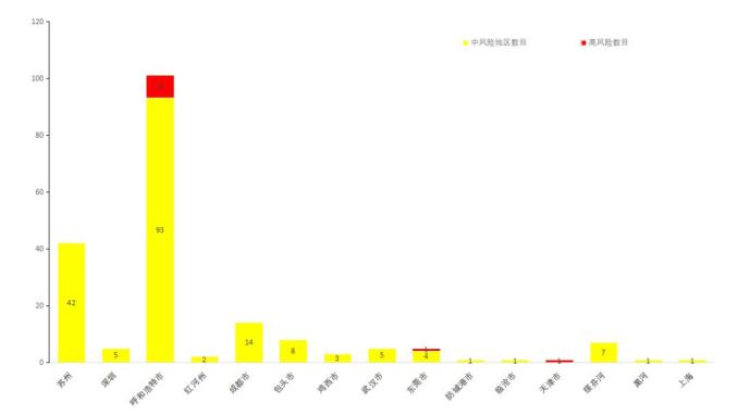 截止2022年3月2日9时:全国共有高风险地区10个,其中内蒙古自治区呼和浩特市8个,广东省东莞市1个,天津市1个。中风险地区187个,其中黑龙江省鸡西市3个,绥芬河7个,黑河1个;广东省深圳市5个,东莞市4个;广西壮族自治区防城港市1个;江苏省苏州市42个,内蒙古自治区呼和浩特市93个,包头市8个;云南省红河州2个,临沧市1个;四川省成都市14个;湖北省武汉市5个;上海市1个。具体如下: