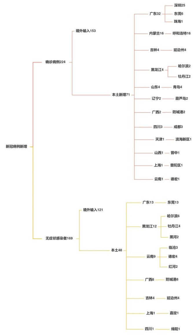 31个省(自治区、直辖市)和新疆生产建设兵团报告新增无症状感染者169例,其中境外输入121例,本土48例(广东13例,均在东莞市;黑龙江12例,其中哈尔滨市6例、牡丹江市4例、黑河市2例;云南9例,其中德宏傣族景颇族自治州4例、临沧市3例、红河哈尼族彝族自治州2例;广西8例,均在防城港市;吉林4例,均在延边朝鲜族自治州;上海1例,在嘉定区;四川1例,在绵阳市);当日转为确诊病例12例(境外输入10例);当日解除医学观察45例(境外输入40例);尚在医学观察的无症状感染者1209例(境外输入896例)。