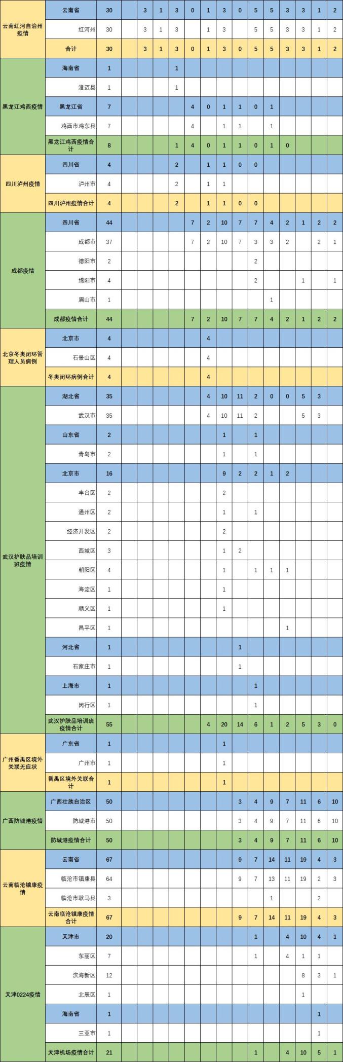 12-北京冬奥闭环管理病例:2022年2月21日报告北京闭环管理冬奥工作人员4例阳性。北京冬奥参赛运动员及其相关的服务人员。工作人员均实行闭环管理,每日一检测,在这种严格的疫情防控政策下,北京冬奥会取得了圆满成功,同时,这种严格的疫情防控政策,也有助于即使冬奥发生运动员或者工作人员感染,也不会引起社会面传播。所以,北京冬奥会闭环管理人员社会传播风险小。13-武汉护肤品培训班疫情:武汉新冠病毒核酸检测阳性病例初步鉴定为奥密克戎变异株,此培训班的培训时间为2月18日至20日,地点设在武昌区凯莱熙酒店和江岸区华清园小区内,共有66名学员参加,其中24人已离汉,目前疫情已经波及北京市多个区县、山东省青岛市、石家庄和上海。