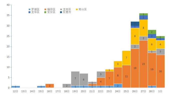 4-0212广东系列疫情:0212以来,广东深圳东莞等地发现多例感染者,呈现多链条传播,称为0212广东系列疫情。3月1日0-24时,深圳新增25例新冠肺炎确诊病例,19例在隔离观察的密接人员核酸排查中发现,5例在重点区域核酸筛查中发现,1例在重点人群核酸筛查中发现。