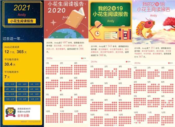 近四年来,@一念之间97 带儿子在小花生坚持阅读打卡,收获的年度阅读报告如下图,2021年首次实现阅读打卡全勤!