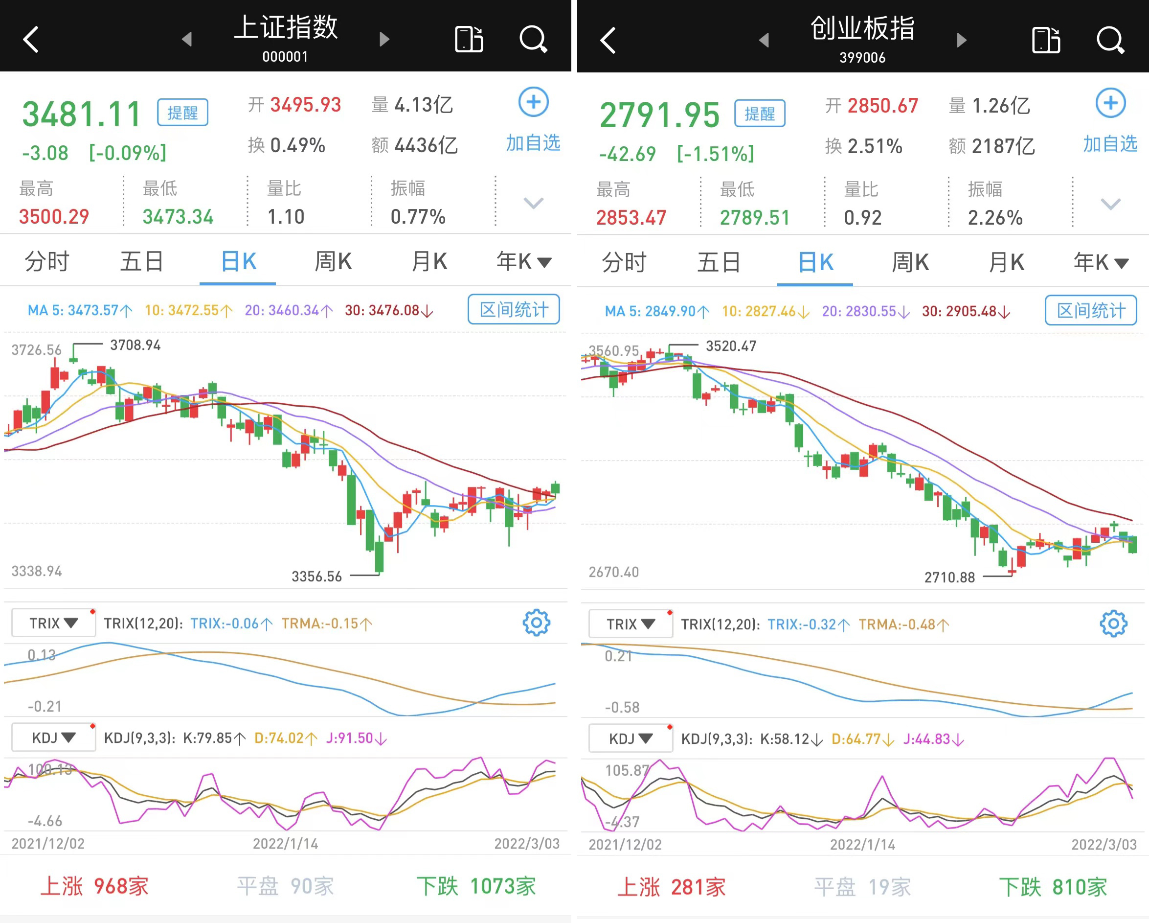至3月3日收盘,上证综指跌0.09%,报3481.11点;科创50指数跌1.66%,报1209.82点;深证成指跌1.09%,报13201.82点;创业板指跌1.51%,报2791.95点。Wind统计显示,两市1884家上涨,2709家下跌,平盘有130家。