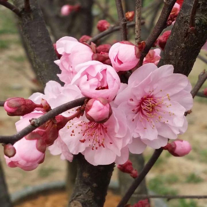 单瓣杏梅杏梅品种群:花期3月上到4月初。为晚花品种;重瓣;花瓣10-32不等;花色淡粉色到淡玫瑰红色。清香;萼片绛紫色。贵妃、云南丰厚、北京丰厚、花束送春。