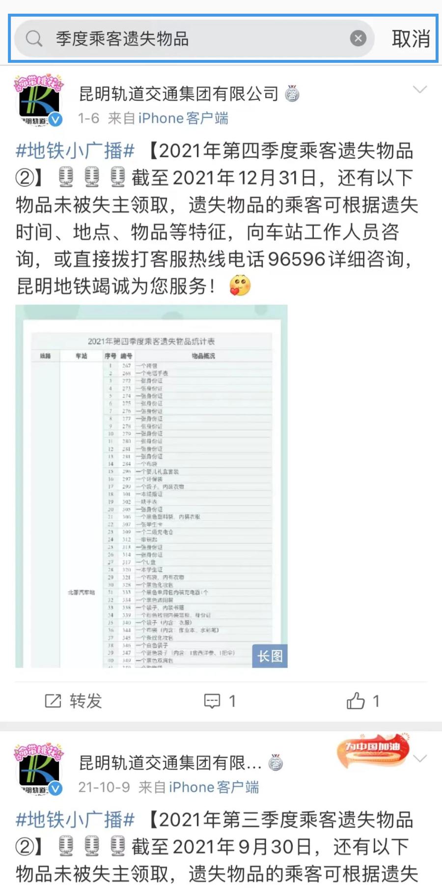 昆明轨道交通集团有限公司→季度乘客遗失物品