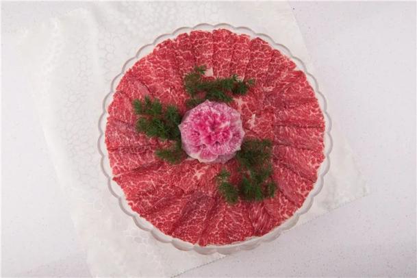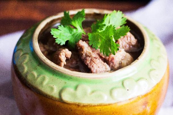 采用瓷罐装上鲜嫩牛肉片,