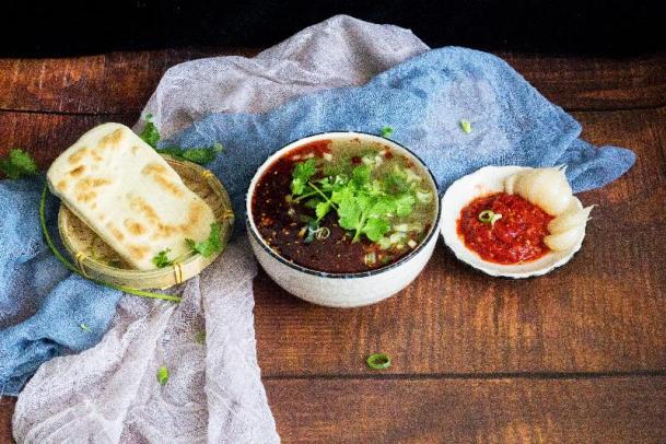 一碗肉汤、一个大饼、一头糖蒜。