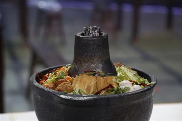 放置木炭烧煮外圈菜肴,