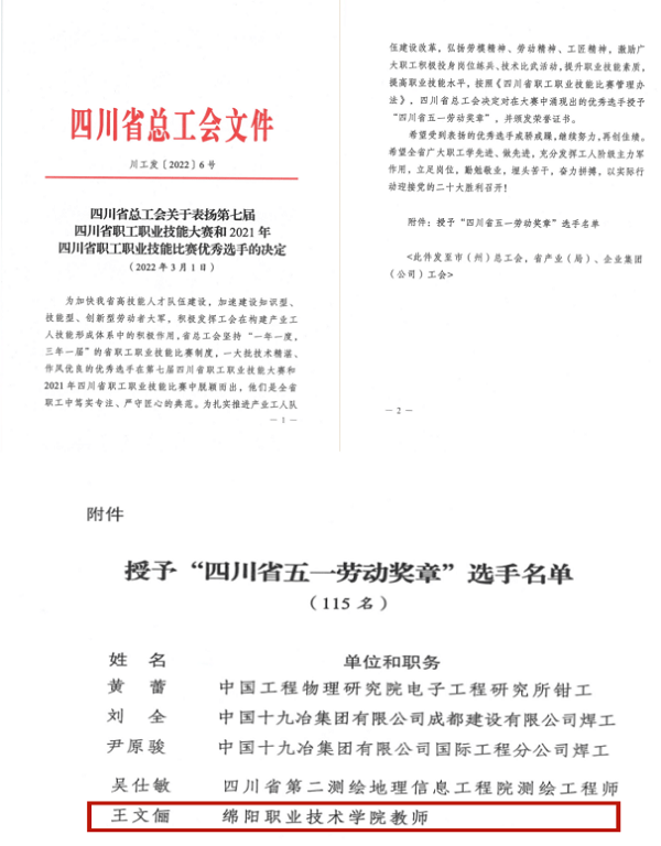 为扎实推进产业工人队伍建设改革,弘扬劳模精神、劳动精神、工匠精神,激励广大职工积极投身岗位练兵、技术比武活动,提升职业技能素质,提高职业技能水平,近日,四川省总工会决定对在第七届四川省职工职业技能大赛和2021年四川省职工职业技能比赛中的优秀选手进行表彰。绵阳职业技术学院旅游与管理学院教师王文俪荣膺“四川省五一劳动奖章”。