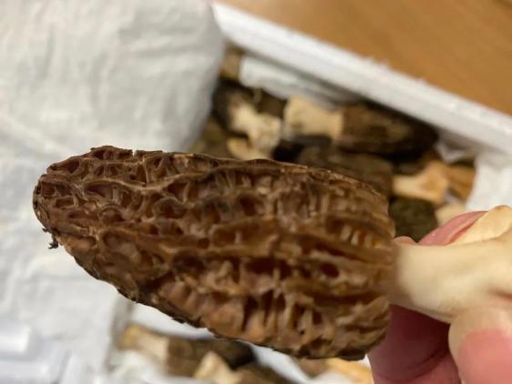 ▲实拍这款从云南快递来的羊肚菌,每一个都很新鲜,扑面有股菇类的香味。