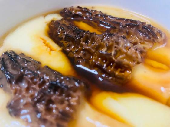 羊肚菌蒸蛋——鸡蛋搅匀后加2.5倍的水,少加点盐,将鸡蛋放锅里隔水蒸。等到蛋液80%凝固了,将羊肚菌放上面,五分钟后出锅撒点酱油即可。