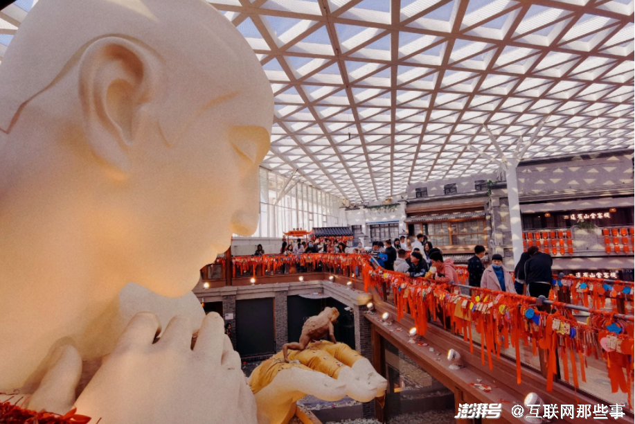 而在商场的顶楼,或者说是“山顶”,则建了一尊白透圣洁的佛像,这个问蟾者的艺术雕塑,进一步渲染了山的氛围感。