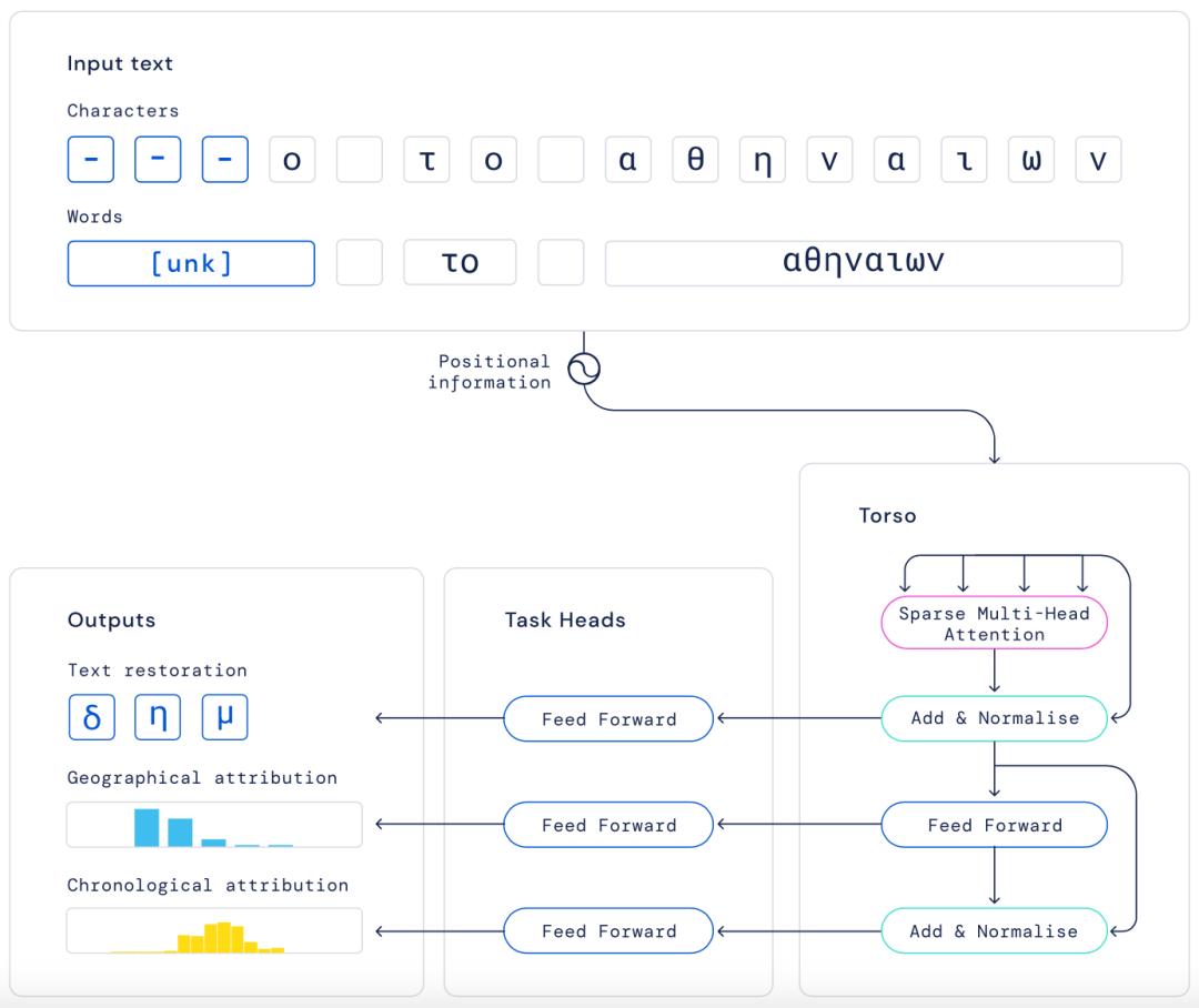DeepMind使用单词和单个字符作为输入来训练模型,以确保Ithaca用这类文本时能正常工作。模型核心的稀疏自我注意机制并行地评估这两个输入,允许Ithaca根据需要评估铭文。
