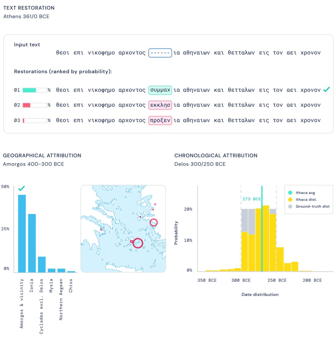 深度神经网络Ithaca即是他们的最新成果,它以荷马史诗《奥德赛》中的希腊岛屿命名,在DeepMind此前专注于文本修复的系统Pythia基础上扩展而成。