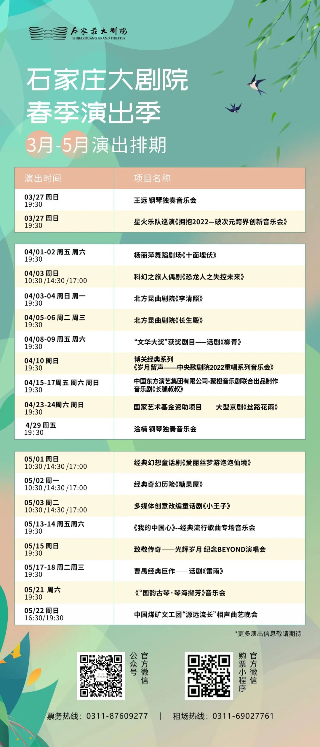 春季演出季力邀国内知名艺术家及团体为石家庄市民带来包括杨丽萍舞蹈剧场《十面埋伏》、中央歌剧院2022年重唱系列音乐会、曹禺经典巨作话剧《雷雨》、“文华大奖”获奖剧目话剧《柳青》、中国煤矿文工团“源远流长”相声曲艺晚会等多台高水准精品剧目。