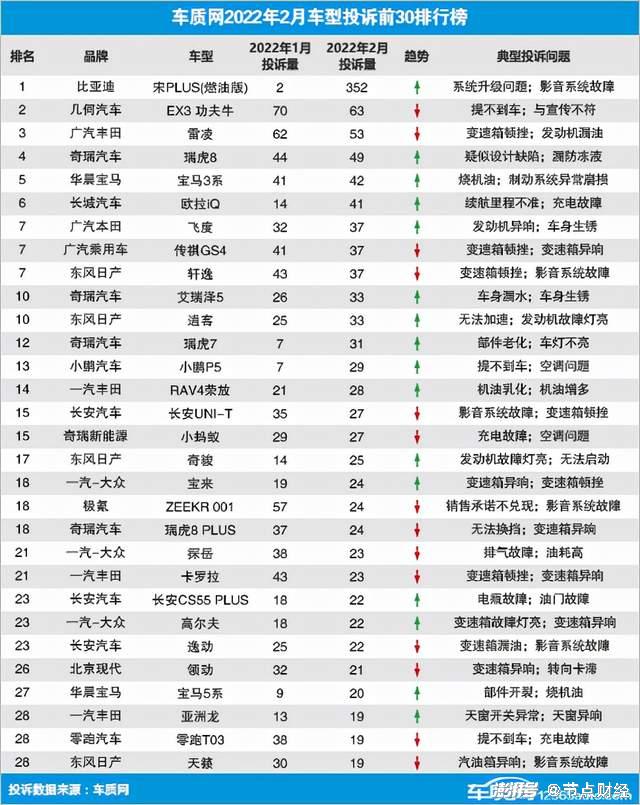 据车质网的数据,刚过去的2月份,该平台有效投诉量排名前三的车系(车型)分别为比亚迪宋(燃油版)、几何汽车EX3功夫牛和广汽丰田的雷凌。