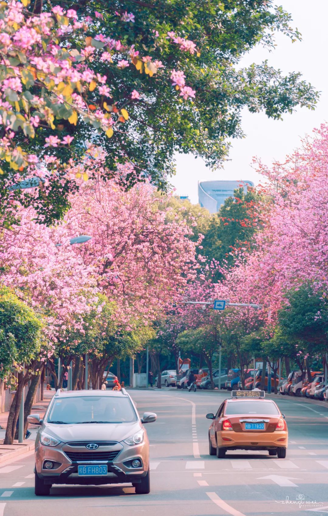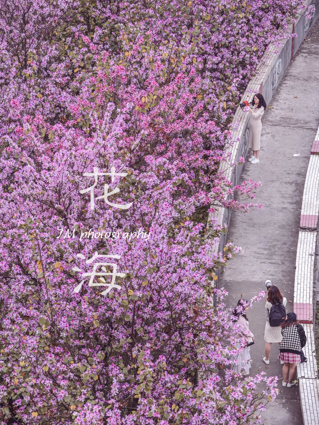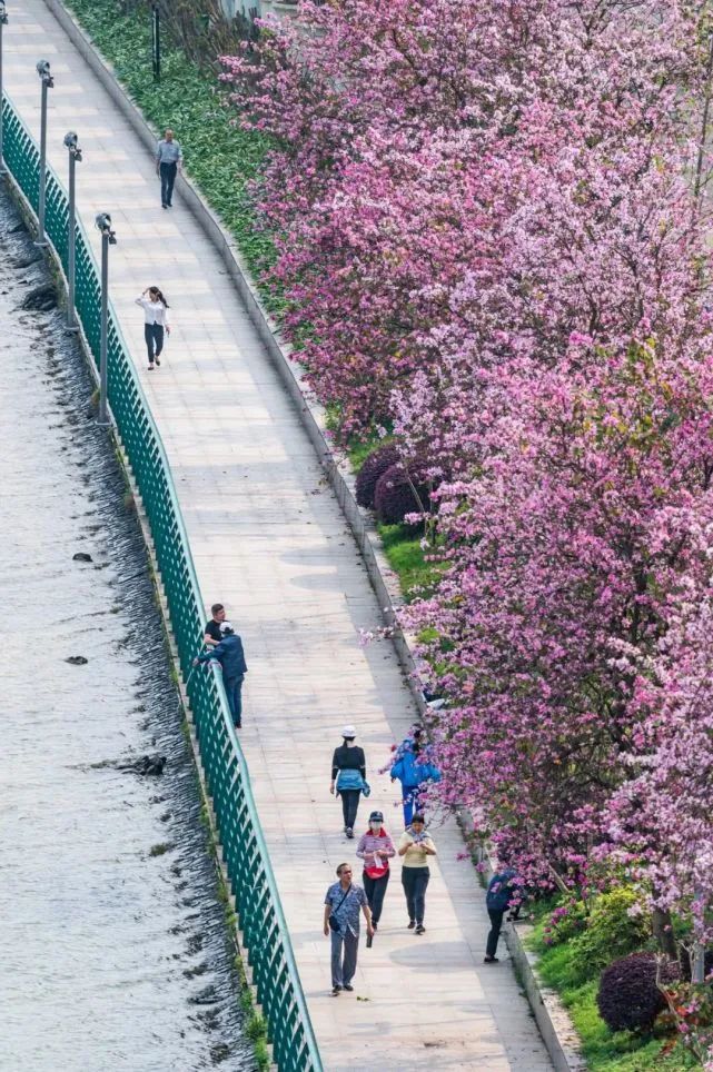 而且,“S”型弯塘路本身也很有特色,从高处看弯塘路,路上的紫荆花也变成粉色的花海曲线,超级浪漫。