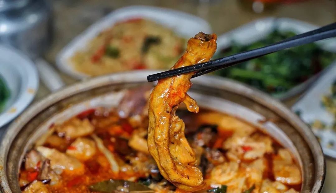 柳州的螺蛳鸭脚煲,将螺蛳、鸭脚、油豆腐、酸笋煲成一锅,吸满了汤汁的食物酸辣爽口,无敌好吃。