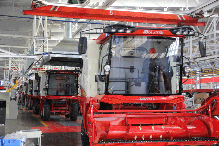 潍柴雷沃生产车间,各类小麦机、履带机、拖拉机等产品有序下线。大约每隔5分钟就会有一台拖拉机下线,日产能达320台,其中大马力拖拉机日产能达120台。