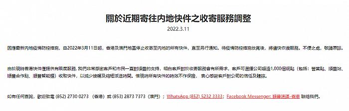 此前,顺丰速运发布公告称,因应最新内地疫情防控措施,由2022年3月11日起,香港及澳门地区停止收寄至内地的所有快件,直至另行通知。待疫情防控措施放宽后,将尽快恢复服务。