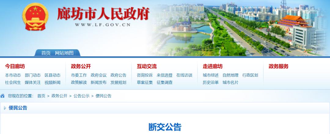 廊坊市排水分区管网源头切改及清污分流工程(二期)在施工期间需要半幅封闭断交施工,具体断交路段与断交方式为:1、爱民东道(银河北路-丰盛路):2022年3月10 日至 2022 年 3 月 30 日,半幅非机动车道封闭断交、半幅通行,逐段交替施工。