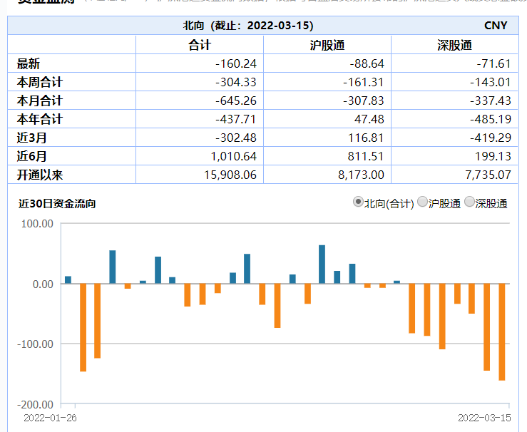 截至3月15日,本月内北向资金已连续7天呈现单边流出的态势,累计减仓超645亿元。