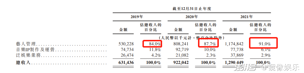 投入低、产出高的偶像产业,让乐华娱乐的主营业务在过去三年里实现了稳定发展。2019年至2021年,乐华娱乐艺人管理业务(包含艺人代言、参与商业活动、参演影视作品等带来的收入)产生的收入分别为5.3亿元、8.08亿元及11.74亿元,在总营收中的占比分别为84%、87%及91%,这项业务的毛利率更是高达50%左右。