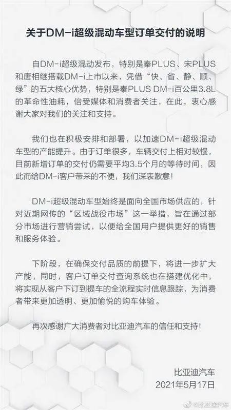 这并非比亚迪首次出现延期交付情况。早在去年,比亚迪官方就针对秦DM-i车型供货问题做出了官方声明,声明中提及“对新订单需要等待较长时间而表示歉意”。并且,其表示将进一步扩大产能,解决交付问题。