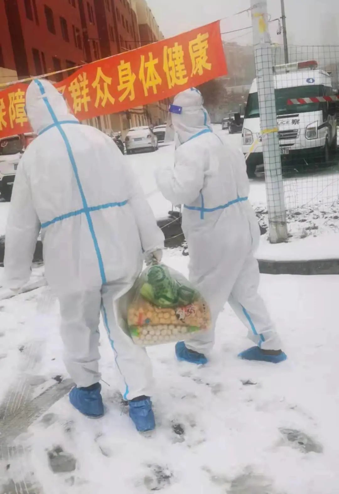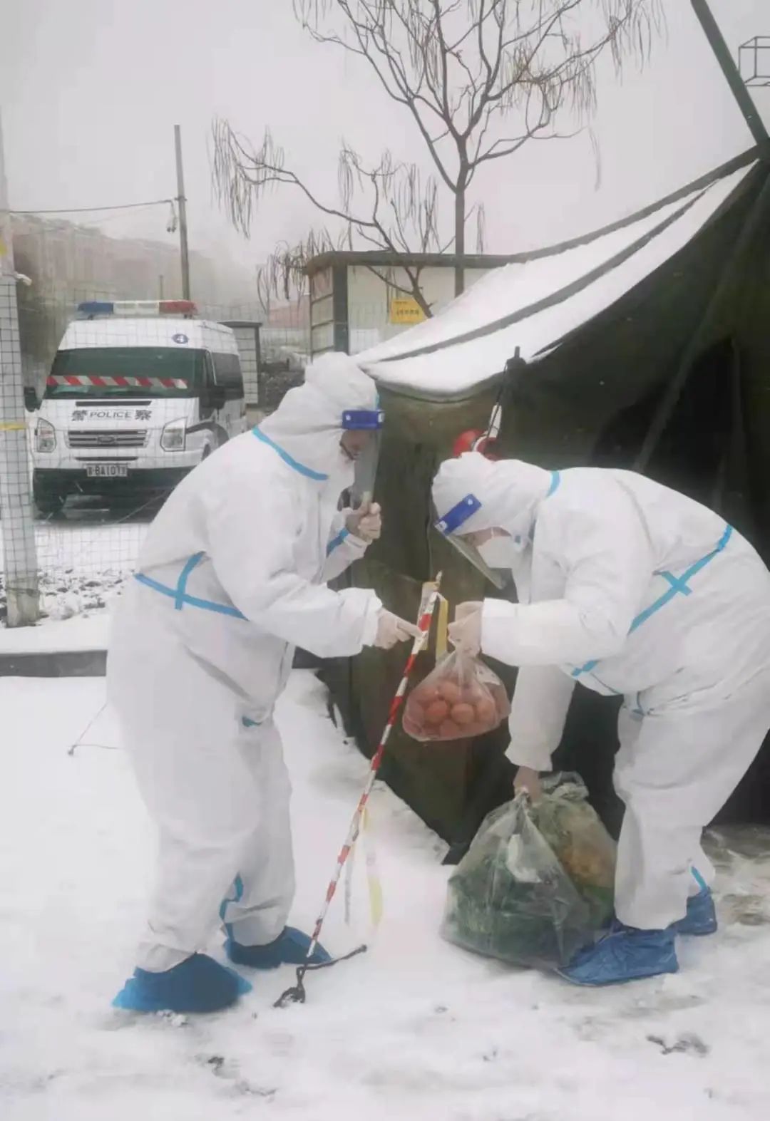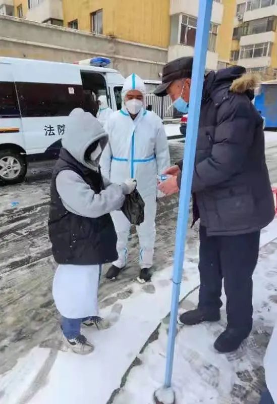 降雪让气温骤降,但也有热心群众的举动温暖着防疫人员的心,他们帮助需要药品的居民买回来送到手中,那不住声的谢谢让人倍感温暖;居民家中的小朋友为他们送来加热的饮品,那一声清澈的“叔叔阿姨你们辛苦了”驱散了所有严寒。