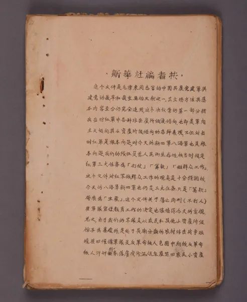 图为1942年新华社印《古田会议决议》红军初创时期,兵员成分复杂,当时存在的一些非无产阶级思想严重地妨碍了党的路线的贯彻执行,这一问题亟待解决。1929年12月,毛泽东、朱德、陈毅在福建省上杭县古田镇廖氏宗祠领导召开了中国共产党红军第四军第九次代表大会(即古田会议)。