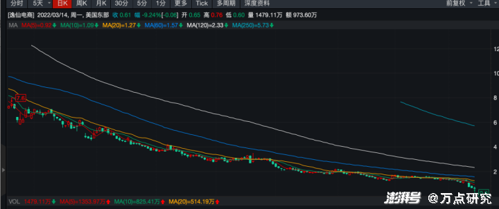 但在风光上市之后,迎来的并不是资本市场助力发展,而是营收增速下滑与巨额亏损。逸仙电商2021年全年营收58.4亿元人民币,较去年同期增长12%,然而在2020年、2019年公司的营收增速分别是72.65%、377.13%,营收增速下滑明显;净亏损则达到了惊人的15.47亿元。截至2022年3月14日,逸仙电商收盘价为0.68美元/股,市值仅为4.3亿美元;较去年高点蒸发155亿美元,暴跌97%。
