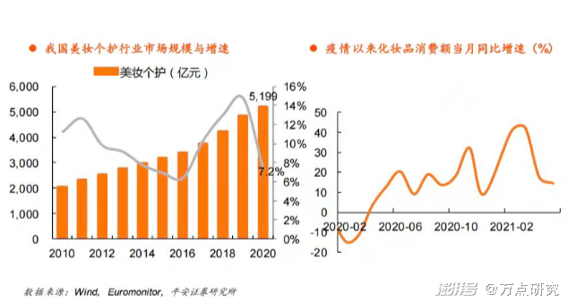 数据显示,2017年以来,国内美妆需求进入新一轮爆发期,即使在2020年疫情严重冲击下,国内美妆个护市场规模仍同比增加7.2%,至近5200亿元。